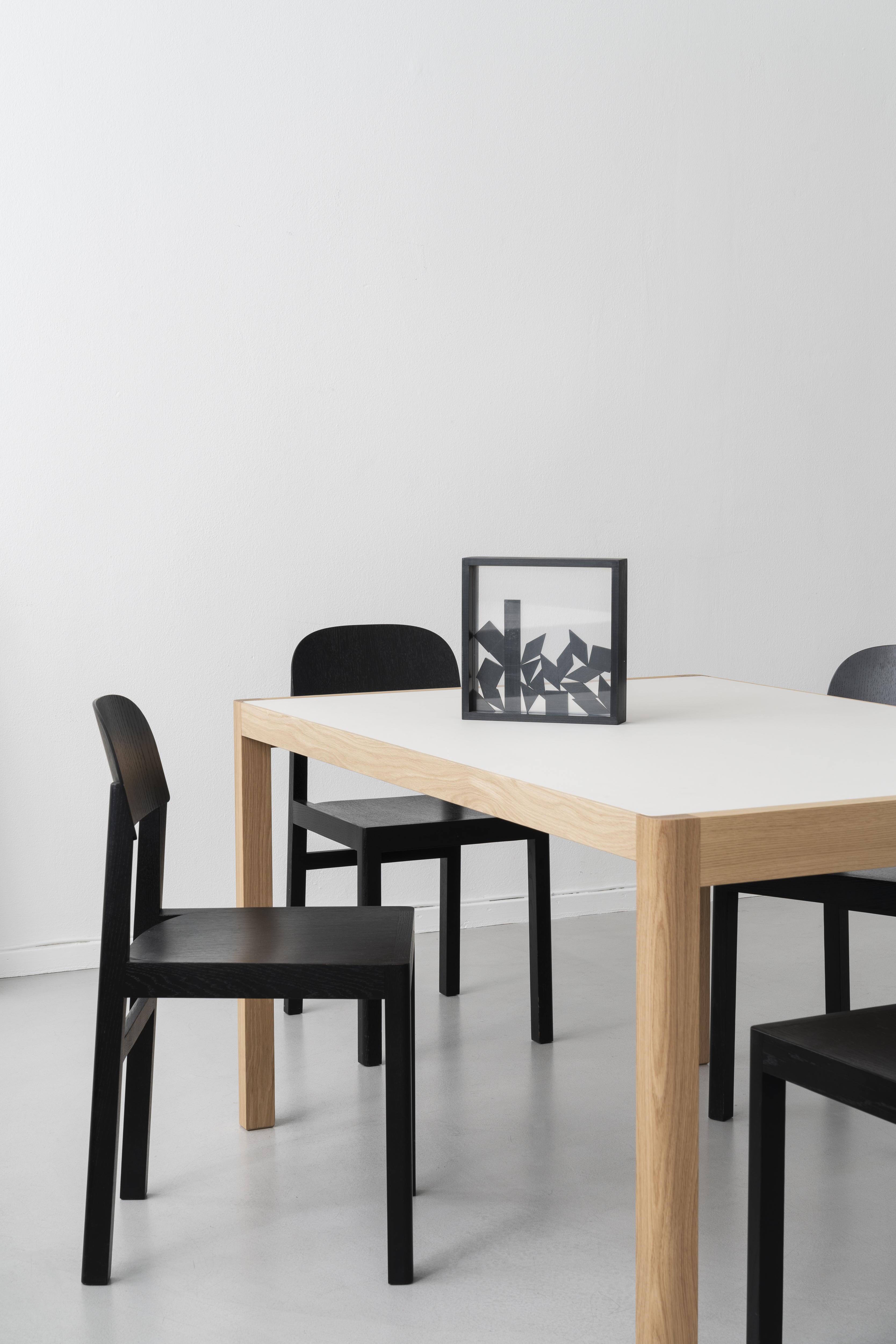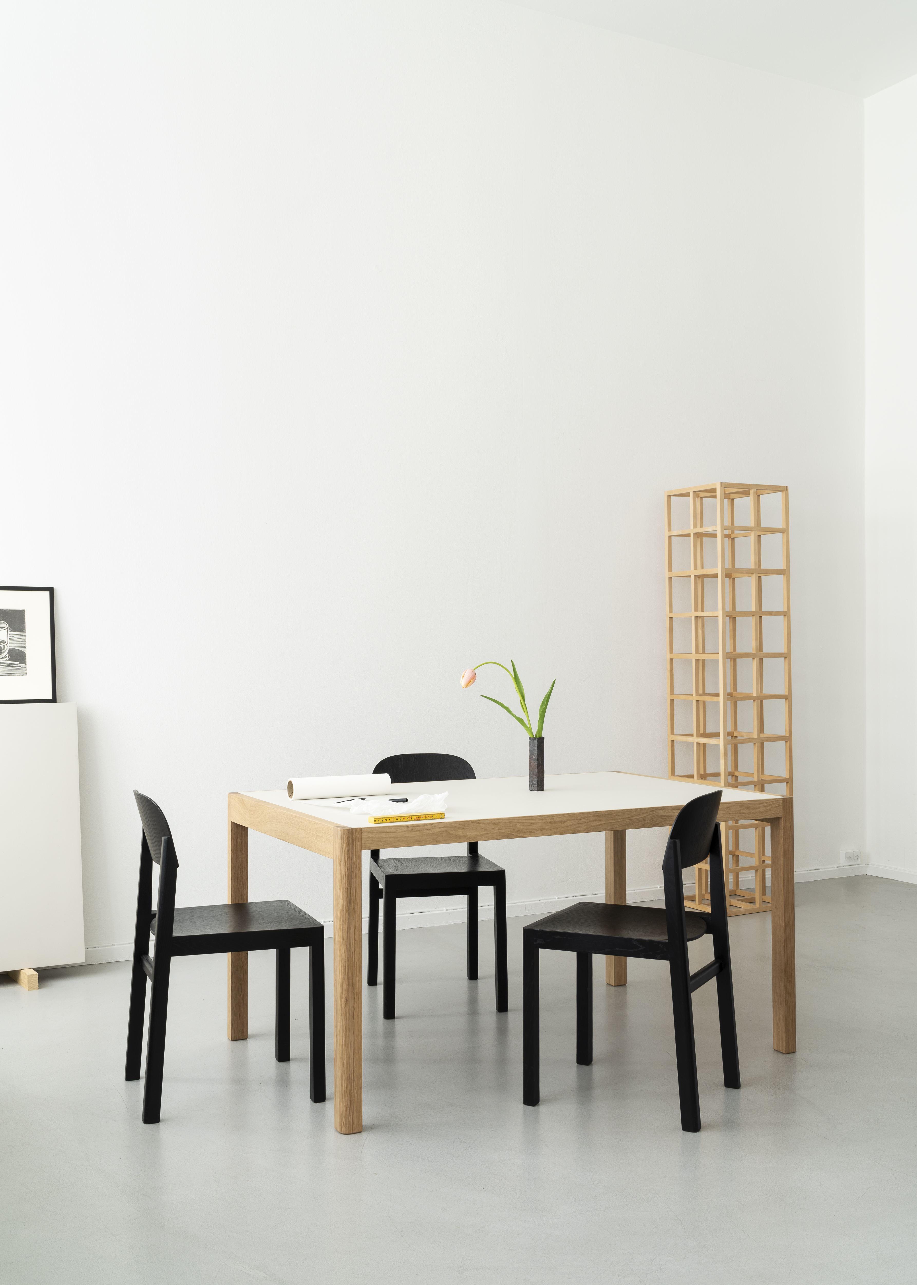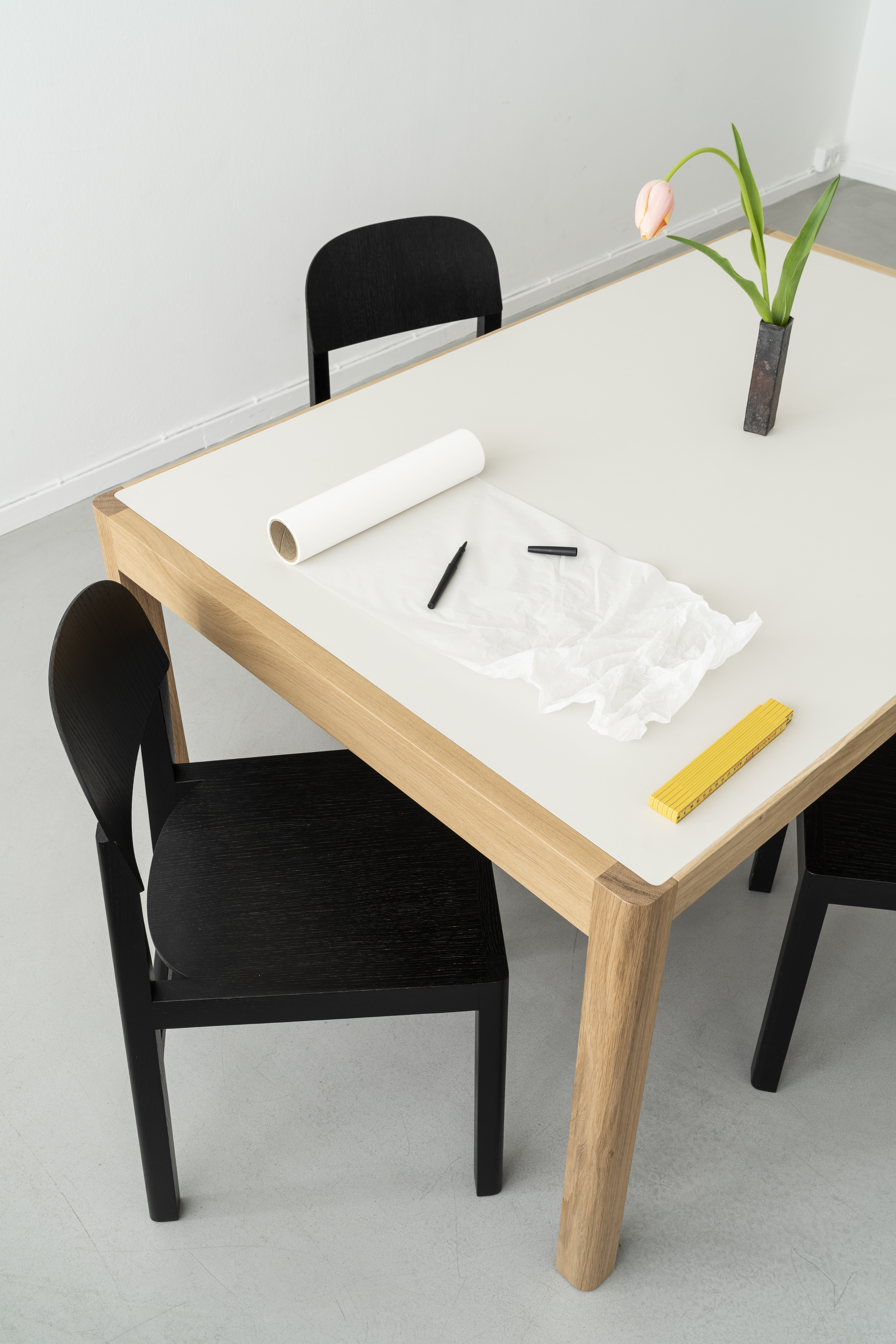 With its tabletop in either oak veneer or warm grey linoleum, harmoniously carving itself into the frame of solid oak, the Workshop Table brings a sophisticated appearance to any space, whether it be a dining setting, workspace or hospitality area.