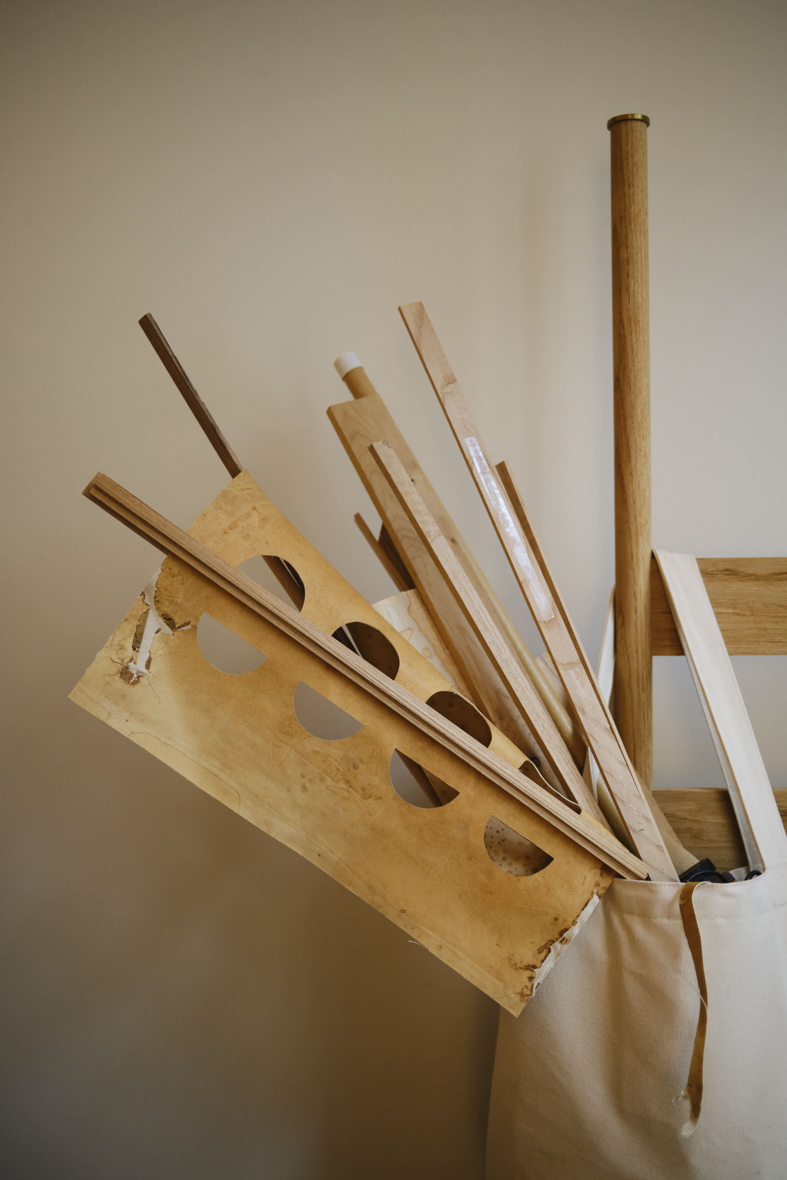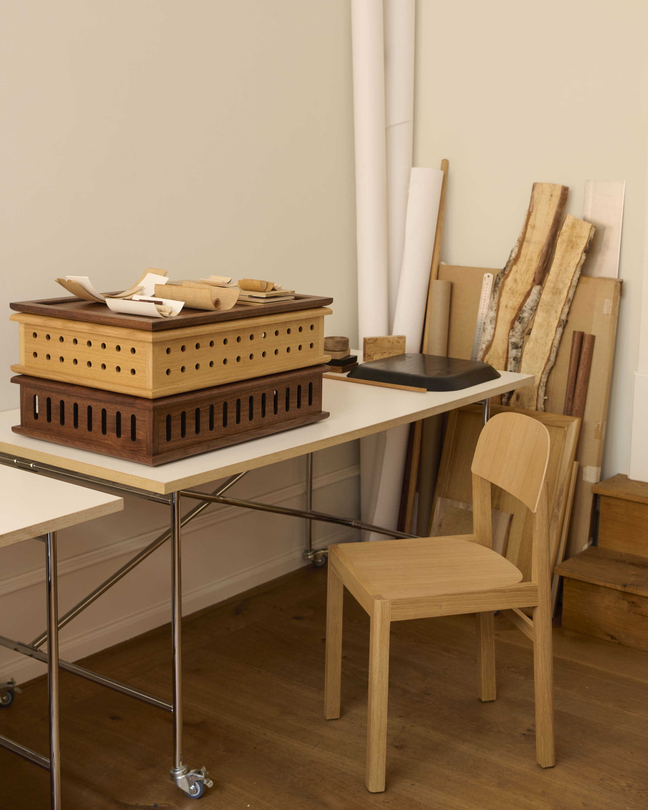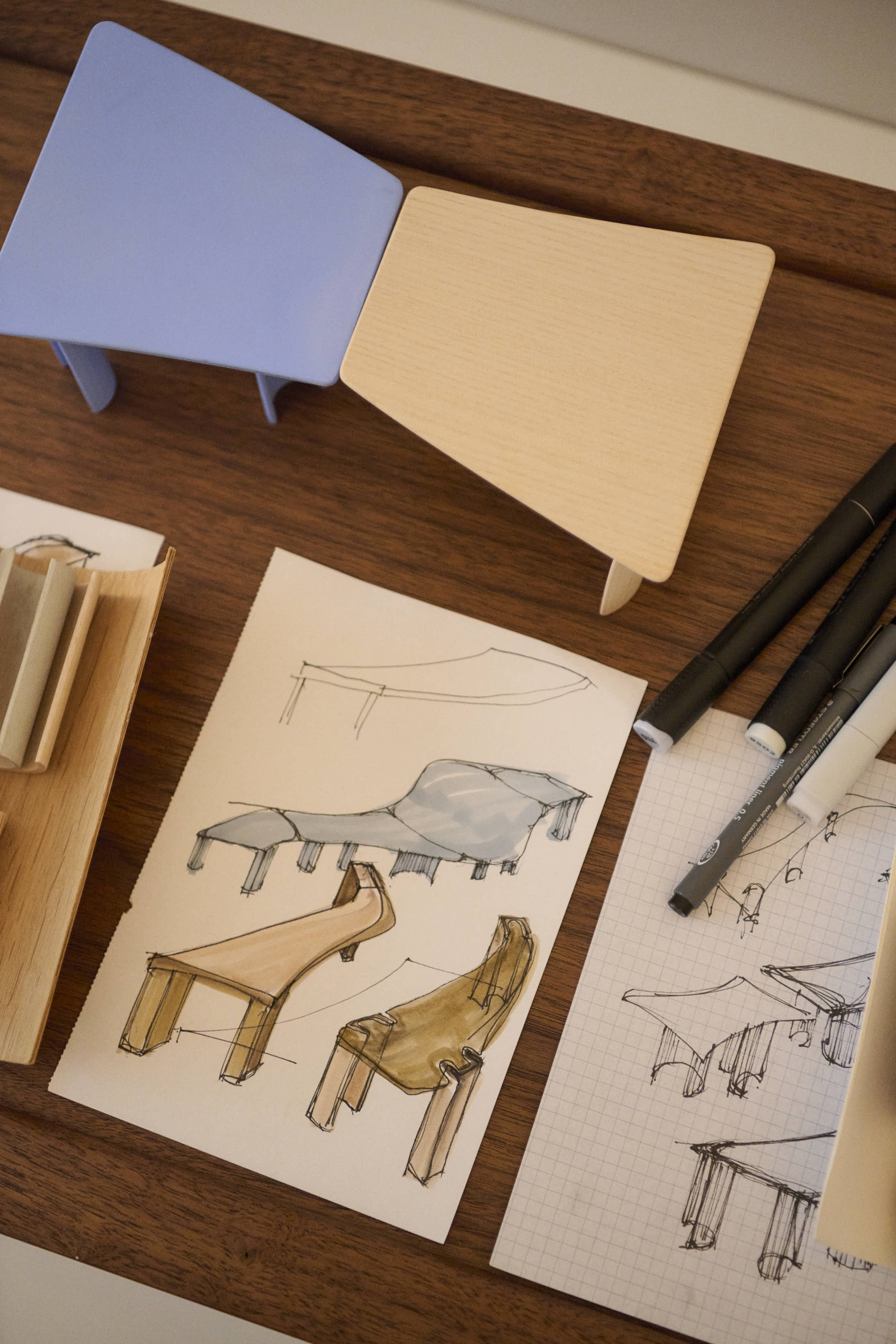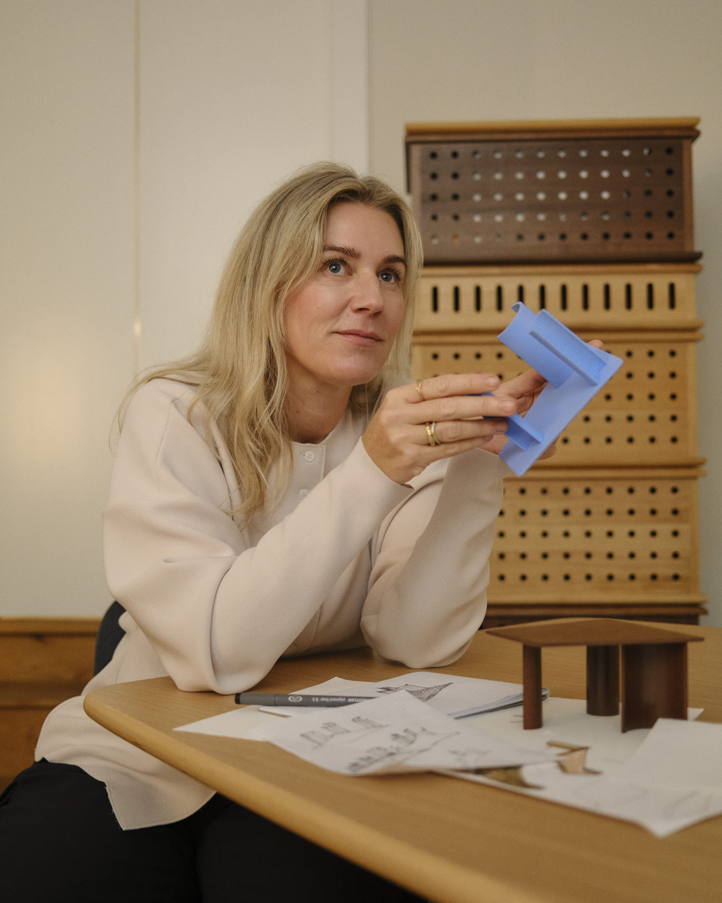 We visited Maria Bruun in her studio in Østerbro, Copenhagen, a bright, open space where large windows draw in daylight and illuminate prototypes, material samples, and working sketches. At the center stands Re-Norm in oak. Its sides are slightly uneven, and as you move around it, the geometry shifts. From above, the form resolves into a sail-like silhouette.