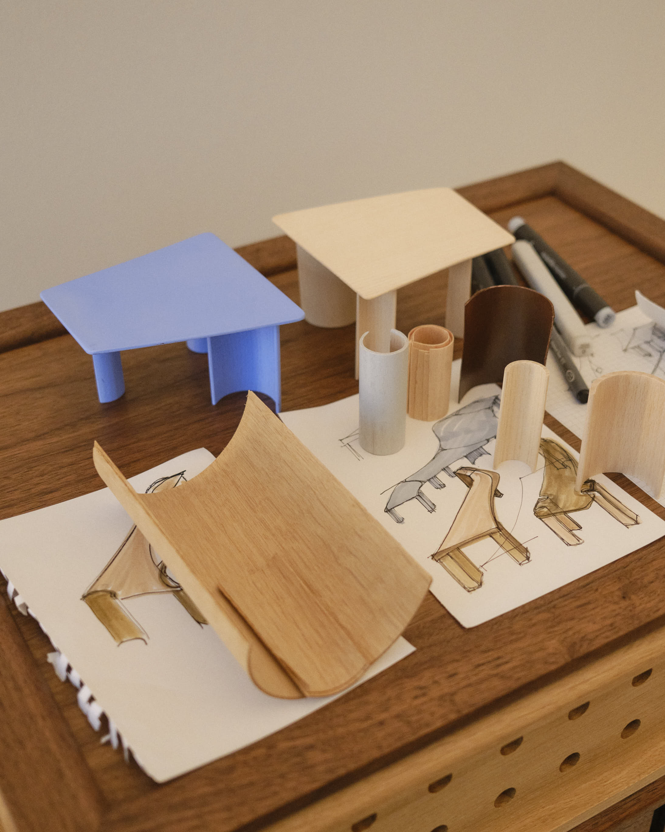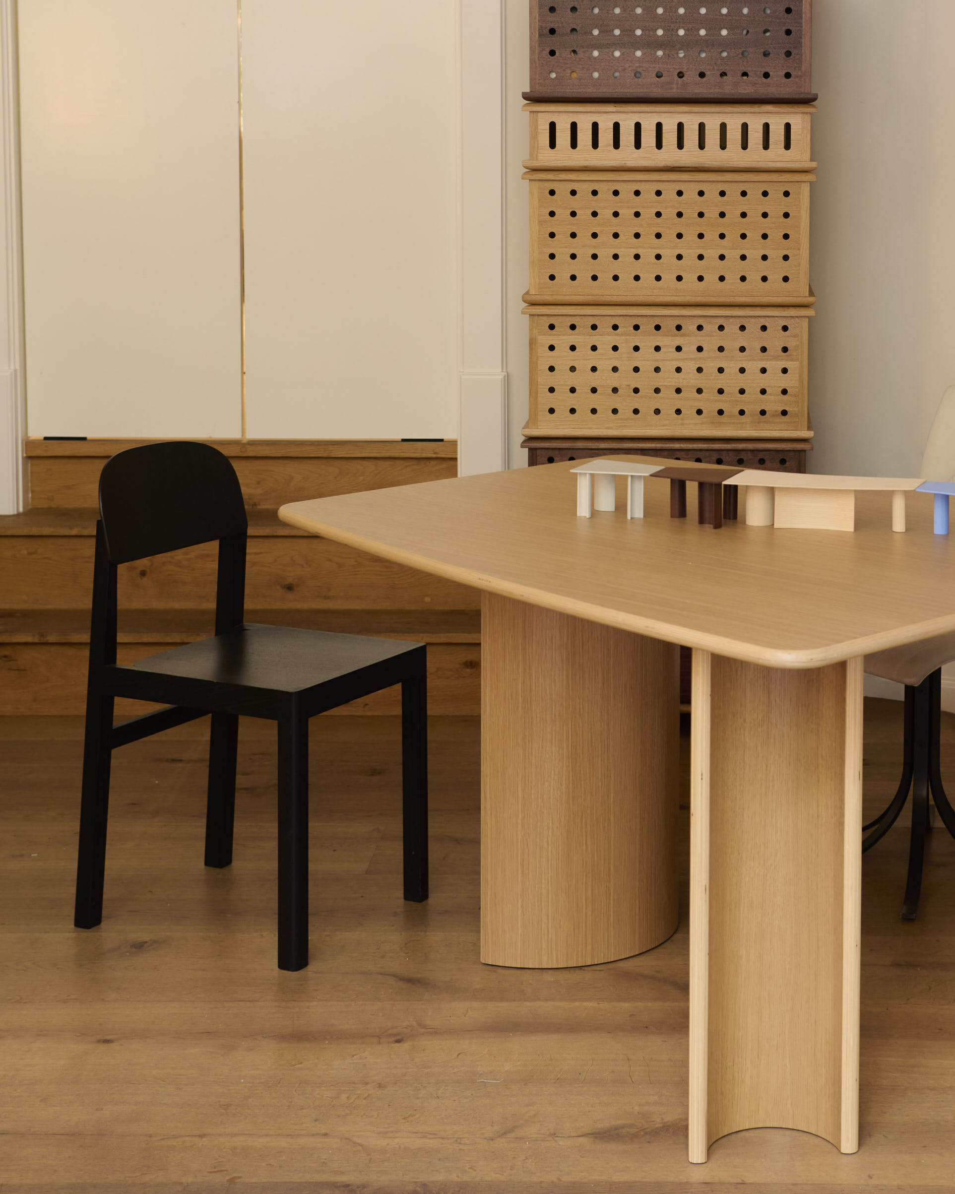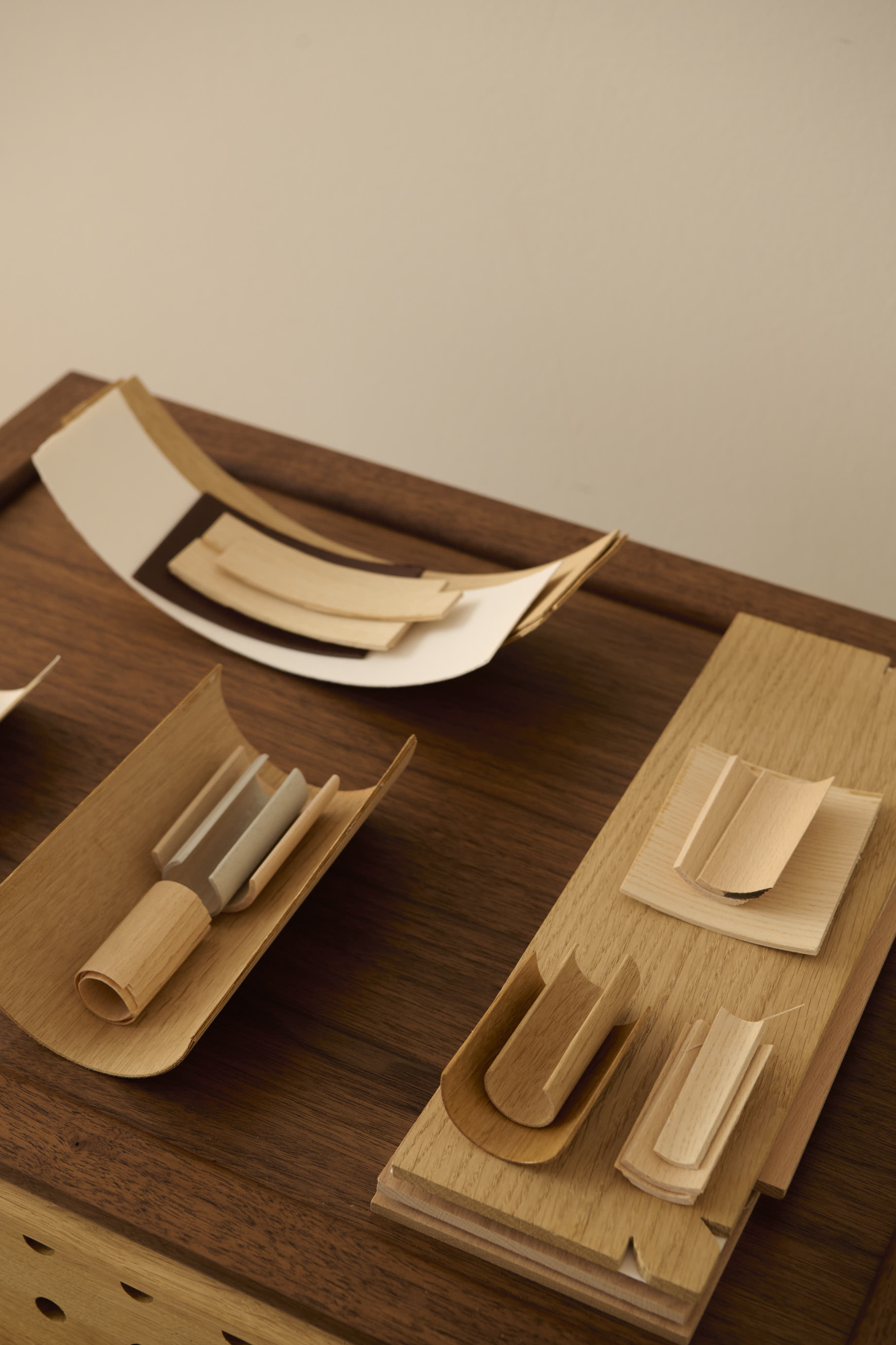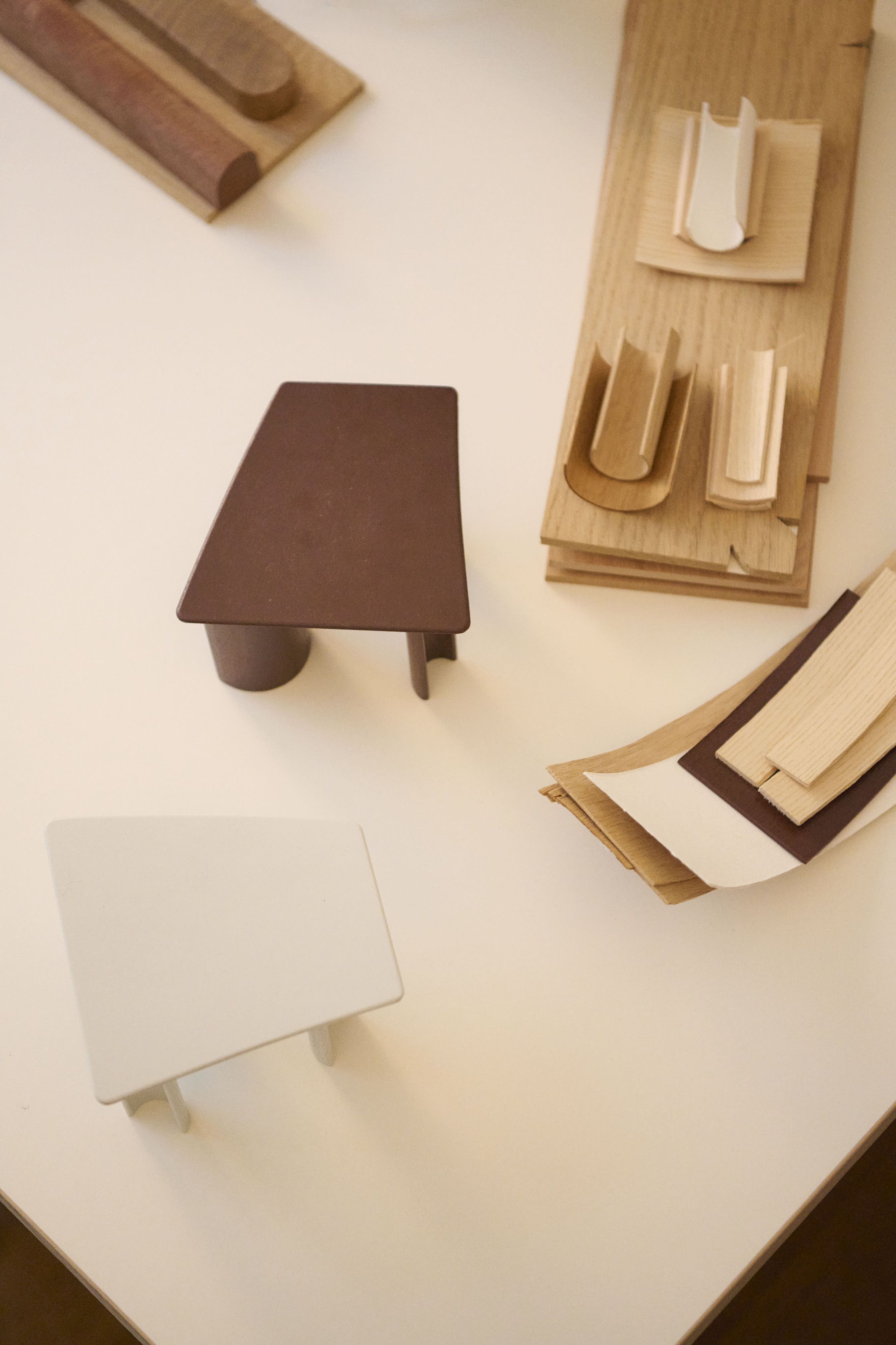 Materiality shaped the project from the beginning. Bruun chose veneer over solid wood, working with pressed veneer construction as both structure and expression. Beneath the tabletop, curved arches support the surface, a detail she refers to as “the smile.”