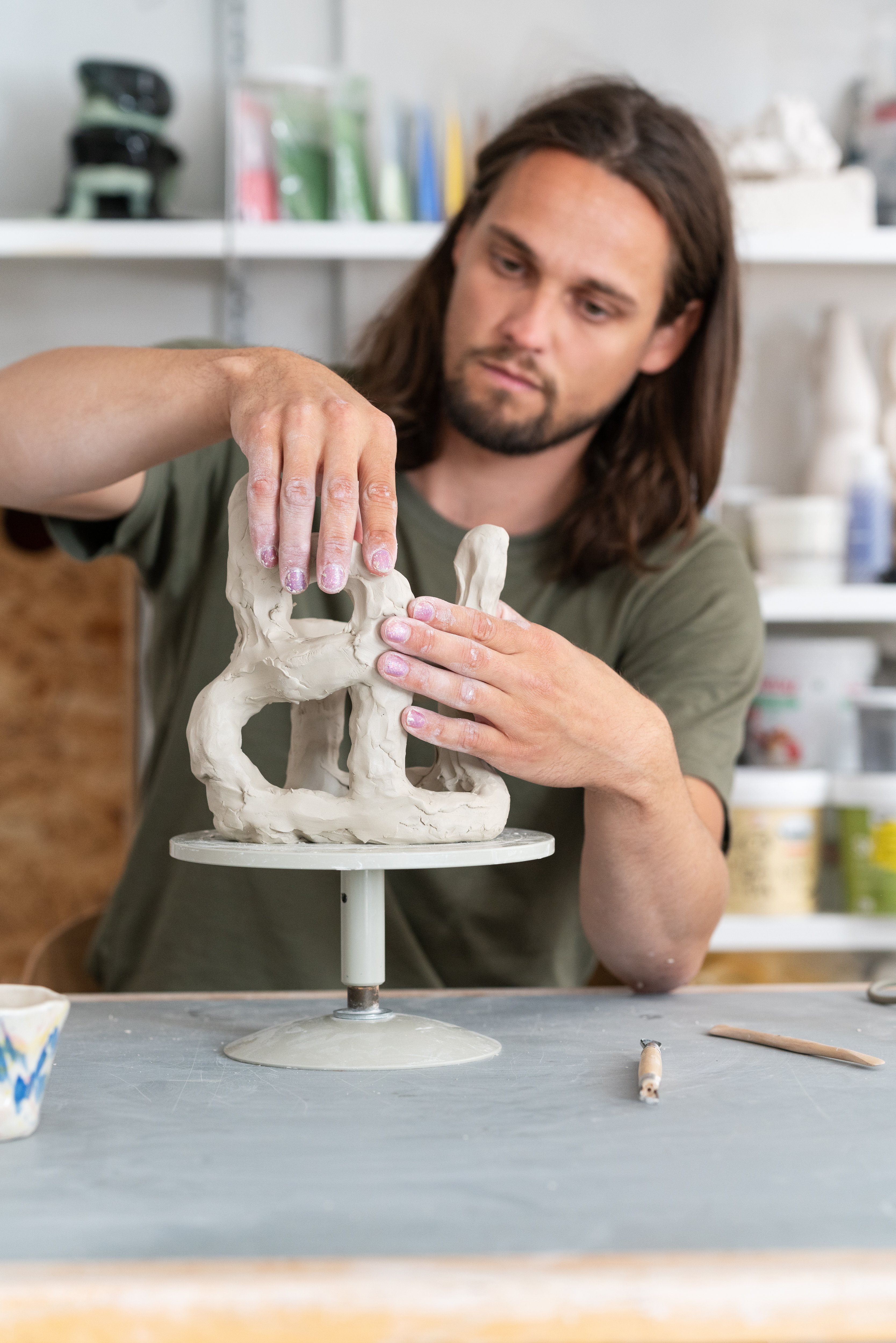 Scattered throughout Kaldahl’s studio are the minute physical elements that permeate his work, be they broken-off tiles, ceramic molds or left-over materials.