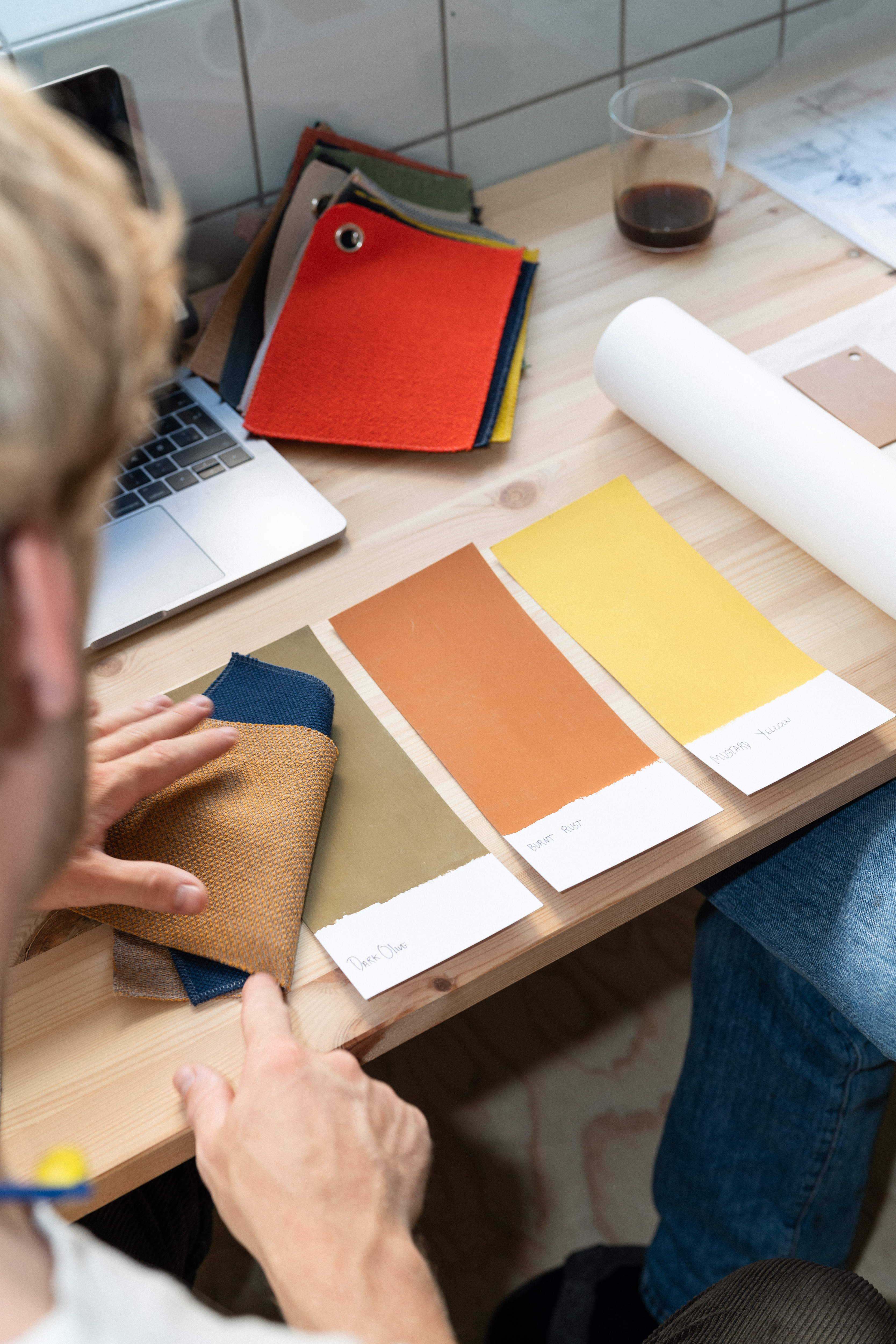 The duo moves towards their work desk upon which textile swatches and sketches used in the process for the exhibition design for Ukurant Perspectives 2021 are scattered. On their thoughts behind the design, Gustav says: “We knew from the get-go that we wanted the design to be an experience that strayed far away from the often polished exhibition formats that are shown at 3daysofdesign,” to which Frederik continues: “For Ukurant Perspectives 2021, the idea is really to get a sense of theatrical scenery. We’ll be using tangled backdrops and exposed stage equipment to create this feeling of a lively exhibition that represents the creative process and the endless paths and possibilities that come with it.”
