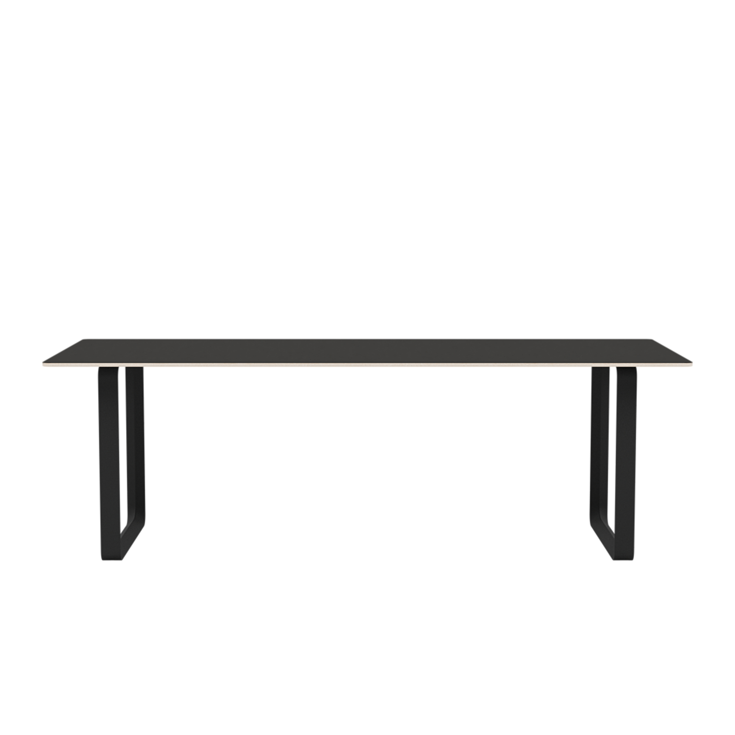 Tabletop in plywood with lacquered oak veneer surface, Black and Grey version in plywood with linoleum surface, White version in plywood with laminate surface (HPL). Solid Oak and Solid Smoked Oak tabletop in FSC™-certified (FSC-C028824) oak. Frame in powder-coated aluminum.