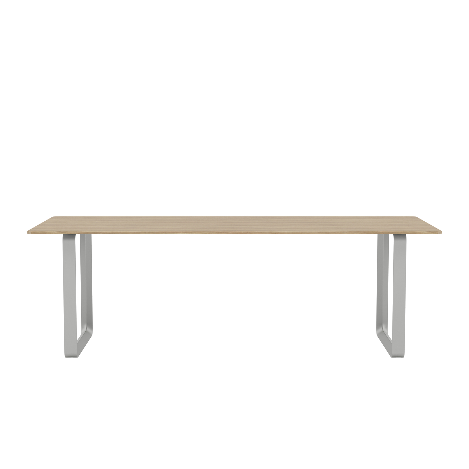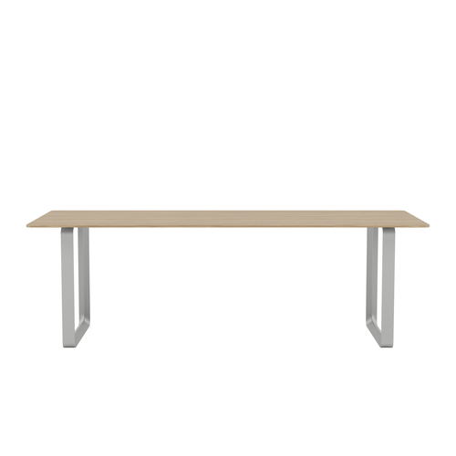 Tabletop in plywood with lacquered oak veneer surface, Black and Grey version in plywood with linoleum surface, White version in plywood with laminate surface (HPL). Solid Oak and Solid Smoked Oak tabletop in FSC™-certified (FSC-C028824) oak. Frame in powder-coated aluminum.