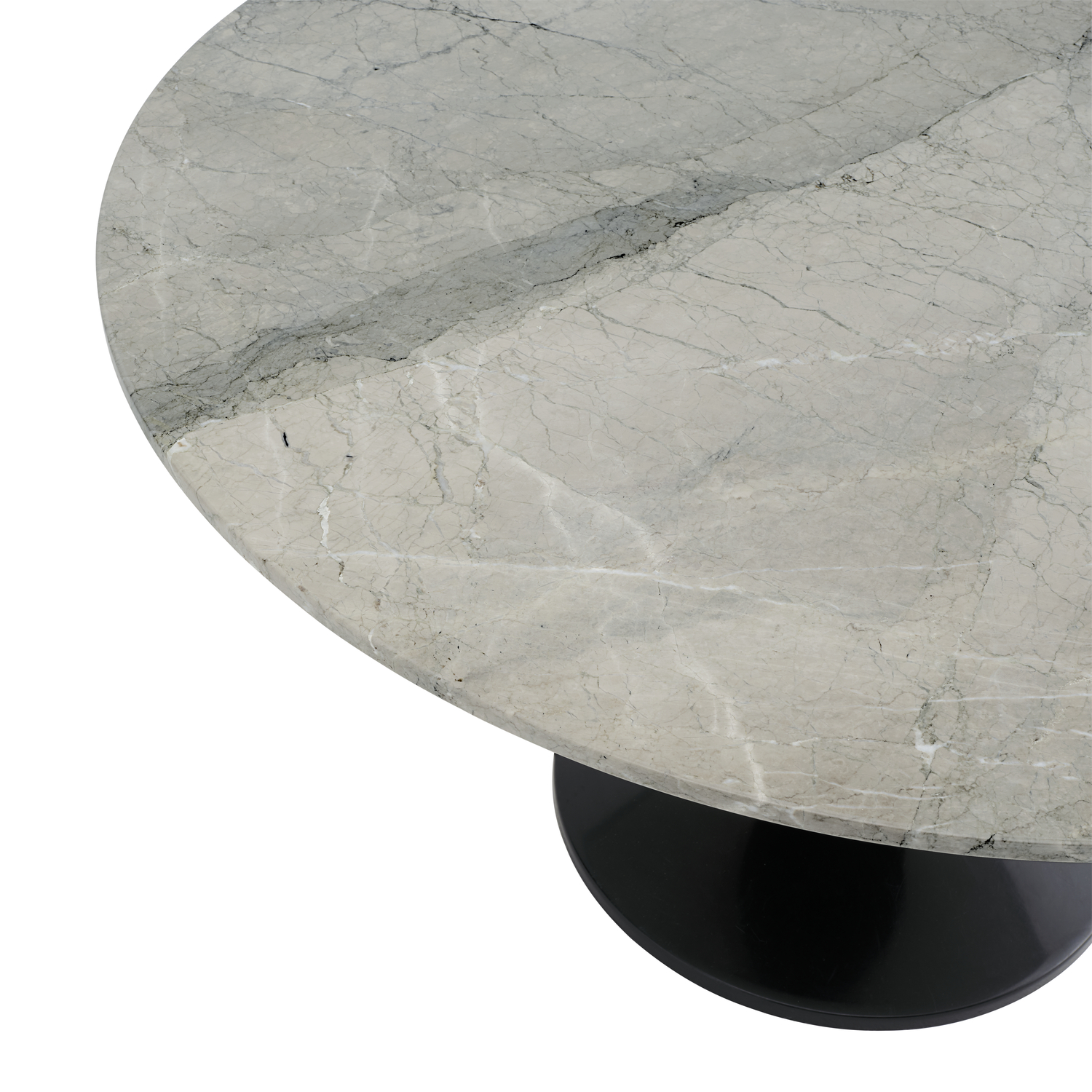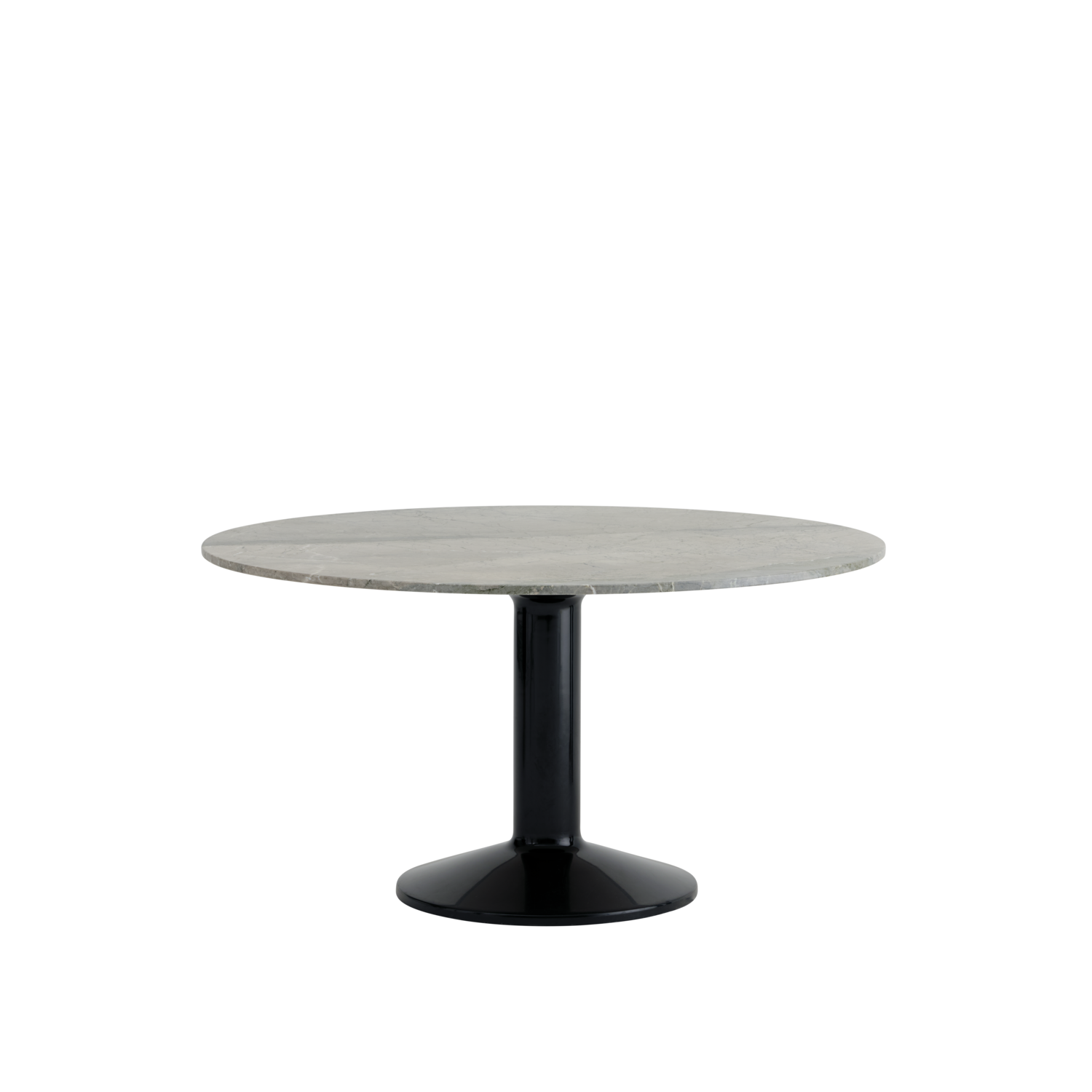 The tabletop is available in lacquered MDF with a black nanolaminate top, lacquered MDF with a linoleum top, marble, or FSC™-certified (FSC-C028824) solid oak, treated with either a clear or dark oil. Nanolaminate tabletops are also made using FSC™-certified (FSC-C028824) wood. The table base is made of powder-coated steel with a protective rubber ring under it.
