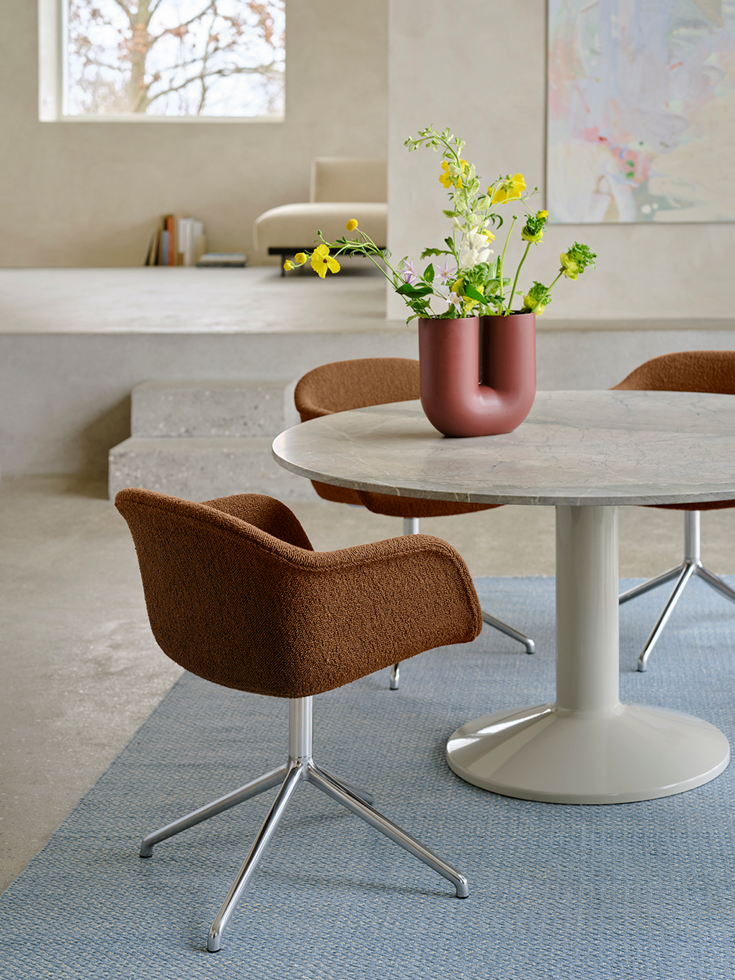 • Midst Table Ø160 cm in Dark Oiled Oak/Black - Fiber Armchair Tube Base Sabi 921/Dusty Green - Rime Pendant Lamp Ø18 cm in Deep Red - Ease Portable Lamp in Light Blue - Silent Vase Ø11 cm in Dark Green - Raise Carafe in Burnt Orange - Raise Glasses in Clear