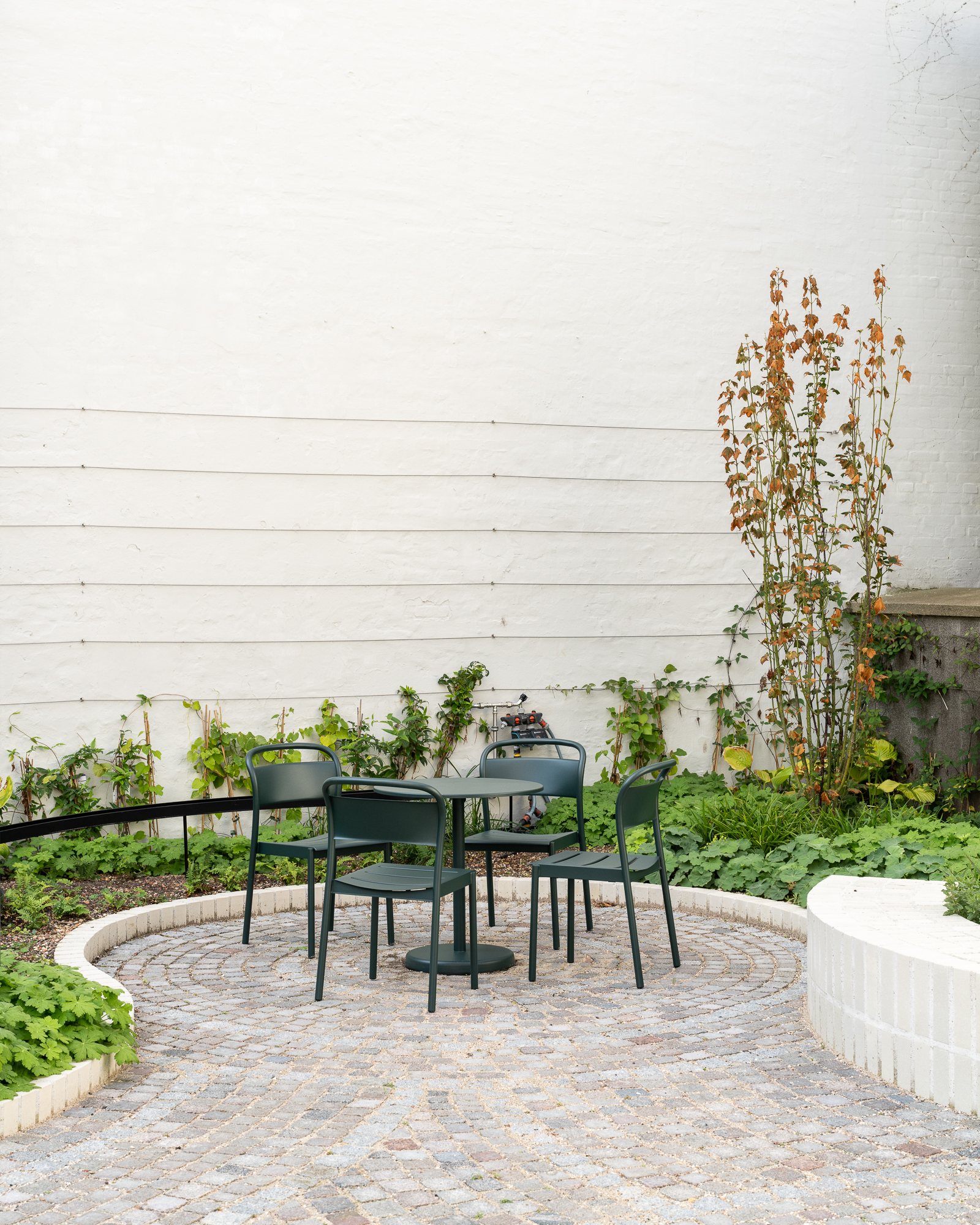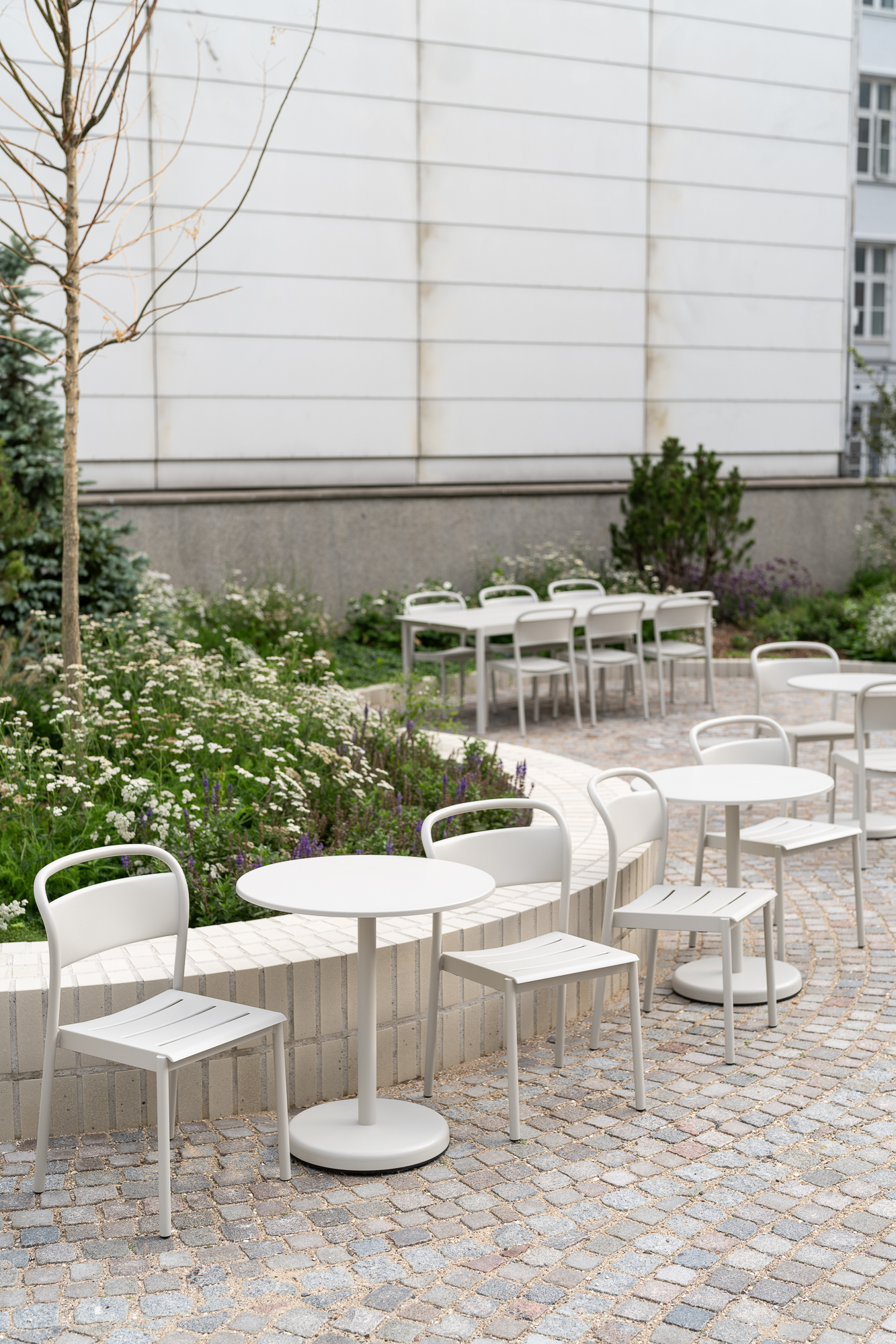 Tucked away in the heart of Copenhagen on Amaliegade, a shared outdoor courtyard offers a peaceful retreat for those working in the surrounding offices. This green oasis, surrounded by lush greenery and bathed in natural light, creates an inviting space designed for relaxation amidst the urban landscape.